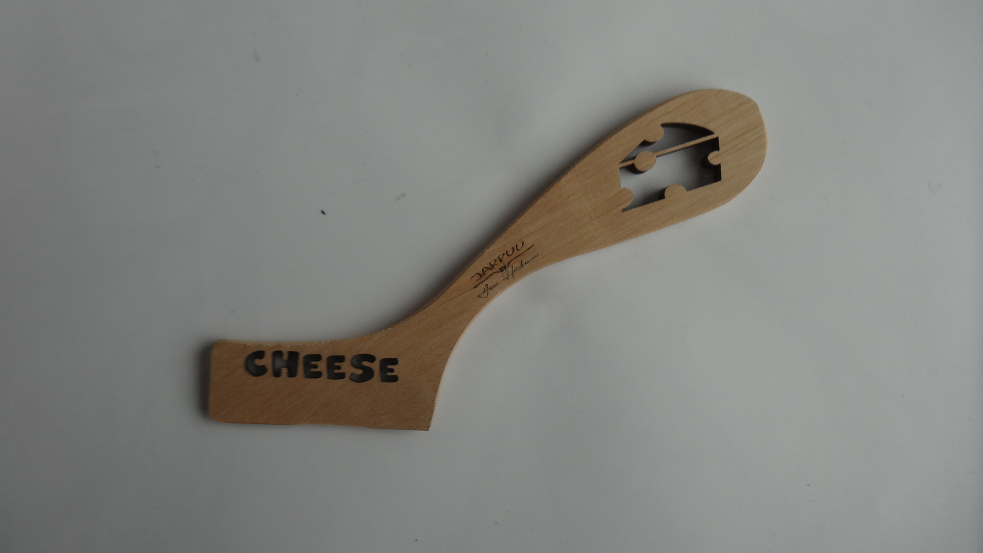 Eri puulajeista tehty Juustoveitsi pehmeille juustoille. koko 15x3x5cm. Valittavissa erilaisilla laserpoltetuilla kuvioilla.